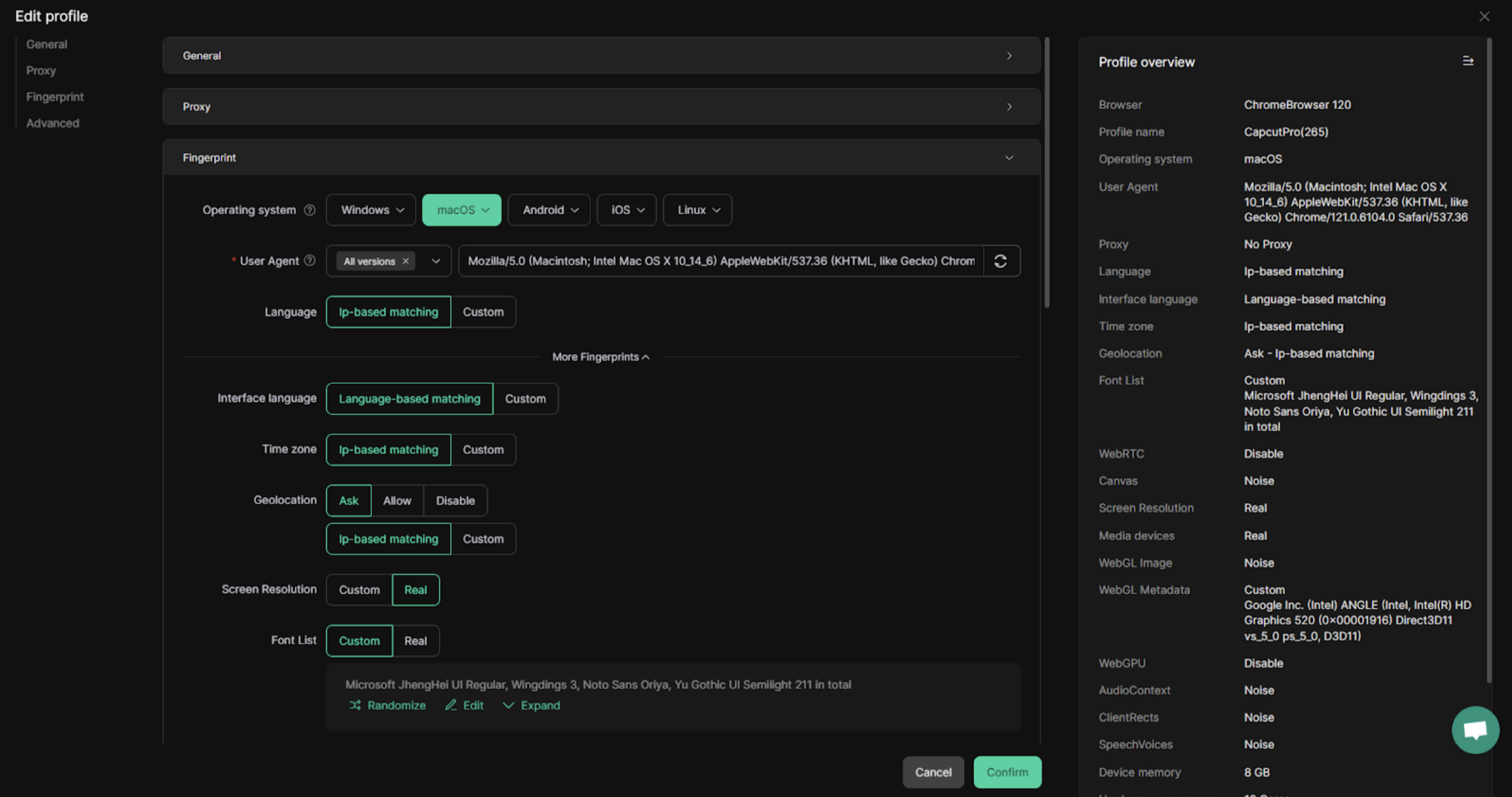 - Choose your fingerprint and advanced settings. Once everything looks good, click “Confirm” to finish creating your profile.