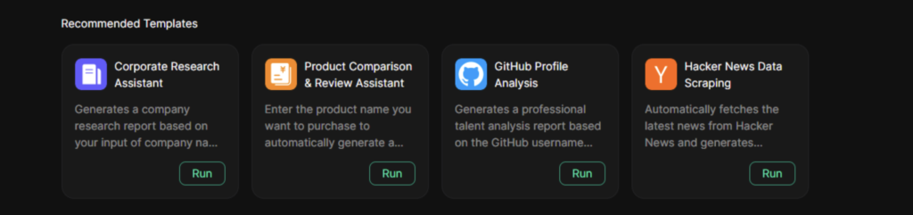 - AI Crawling: helps you collect information from the web automatically. It comes with four ready-to-use templates: Corporate Research, Assistant Product Comparison Assistant,GitHub Profile Analyser, Hacker News Scraper