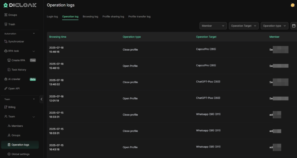 For better accountability, team admins can also view detailed operation logs, including login history, profile usage, and browsing actions taken by each team member. This makes it easy to track who did what, when, and from which device or IP essential for large teams or agencies managing huge projects.