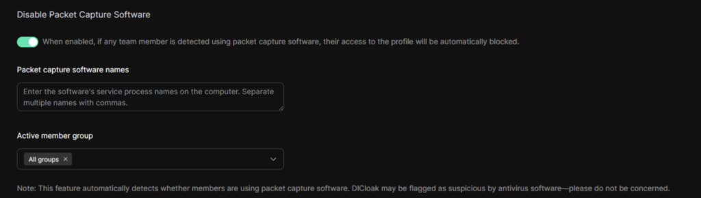 To prevent malicious activity, DICloak detects packet sniffing tools like Wireshark or Fiddler and instantly revokes access for the user. This protects shared profiles from unauthorized monitoring or backdoor threats.