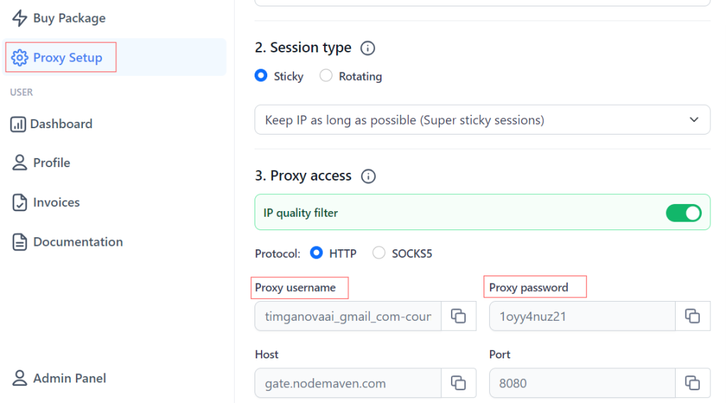 You can find your Proxy username and Proxy password on your NodeMaven page in the Proxy Setup section.
