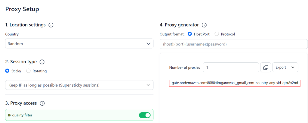 3. You can find your Proxy username and Proxy password on your NodeMaven page in the Proxy Setup section.