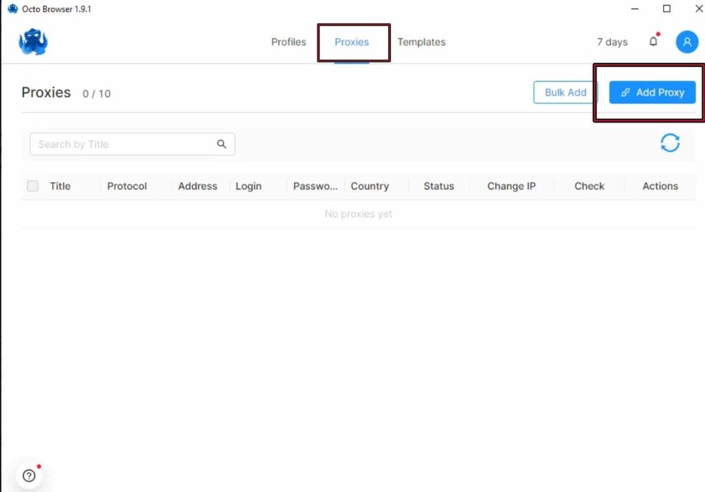 1. Click “Proxies” > “Add proxy” to add your proxy details.