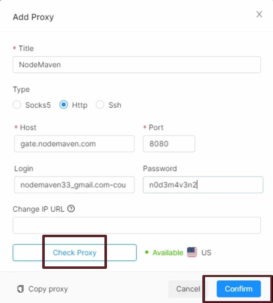Once you see the sections have been filled out, please proceed by clicking the “Check Proxy” button. This action will display the Country you’ve chosen. Then, click “Confirm“, to save your profile.