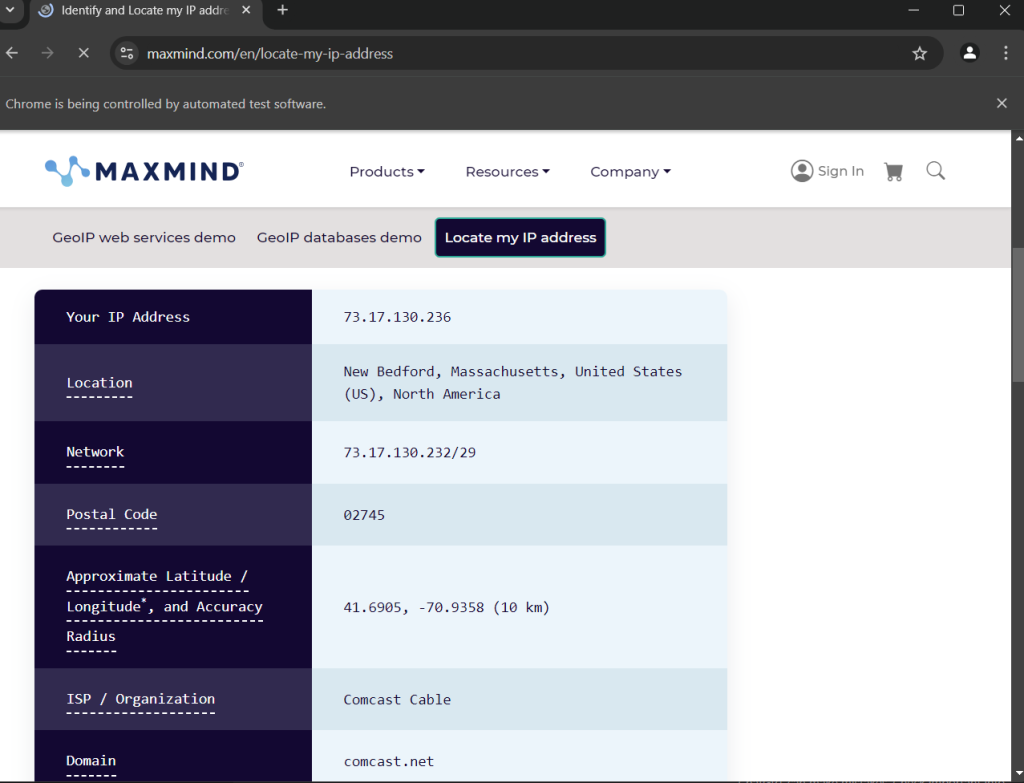 As an expected output the browser will open, navigate to https://www.maxmind.com/en/locate-my-ip-address
